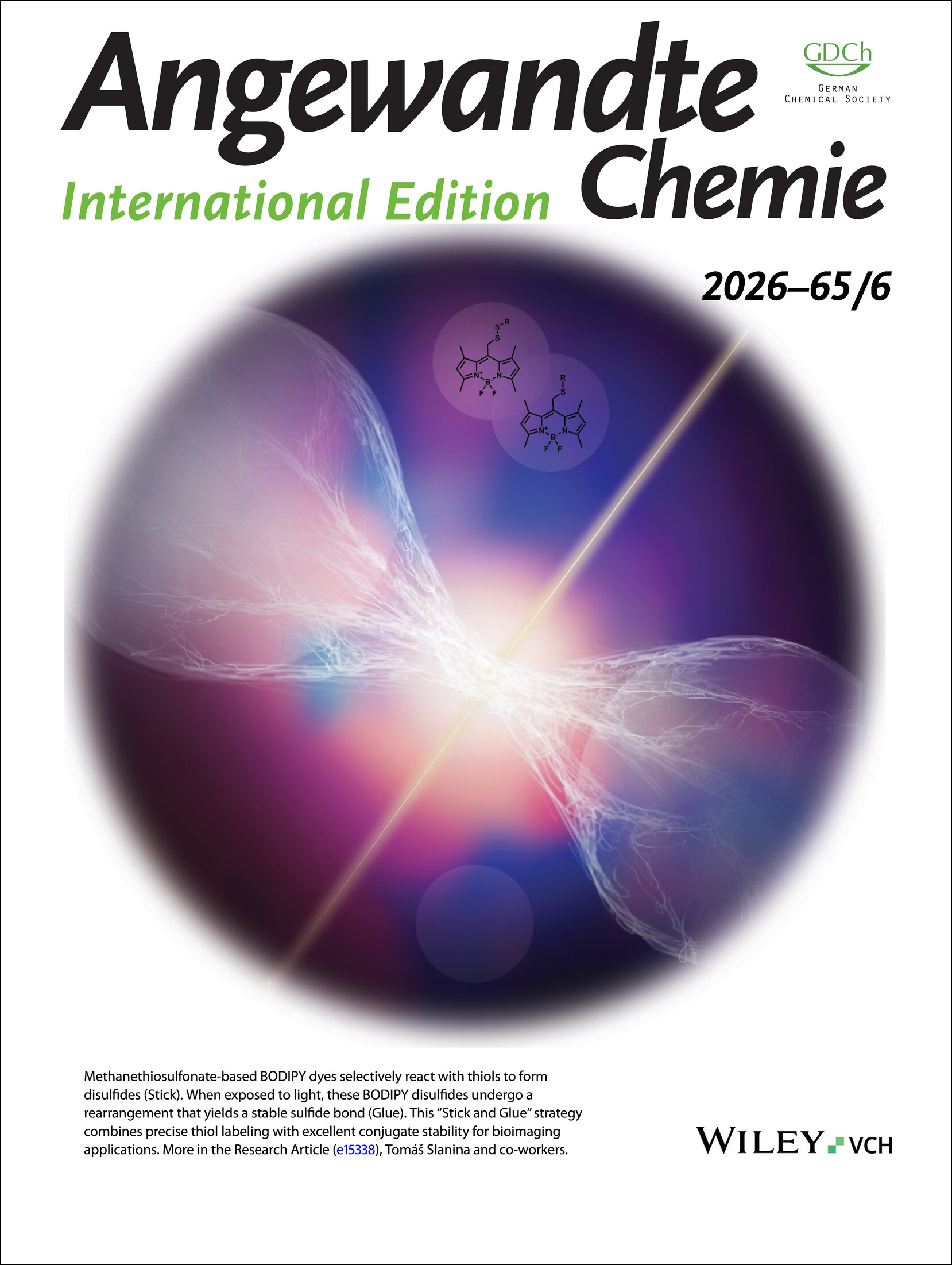 - Article: Šálková, L.; Dunlop, D.; Tütüncü, B. B.; Knejzlík, Z.; Slanina, T. Thiosulfonate-Derived BODIPY “Stick and Glue” Strategy for Fluorescent Thiol Labeling. Angew. Chem. Int. Ed. 2026, 65 (6), e15338. https://doi.org/10.1002/anie.202515338